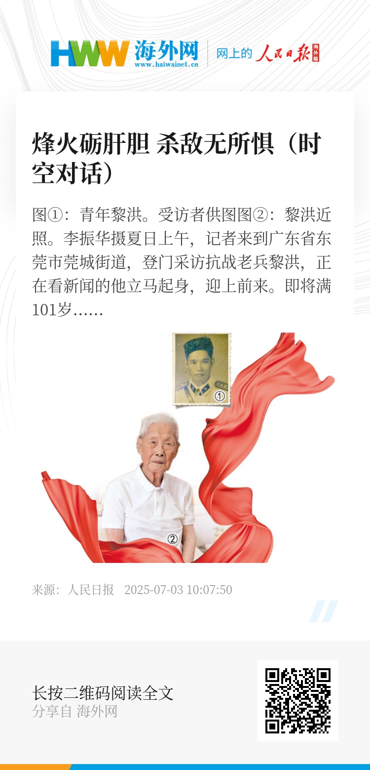 夏日上午,记者来到广东省东莞市莞城街道,登门采访抗战老兵黎洪,正在看新闻的他立马起身,迎上前来。即将满101岁的黎洪,虽已白发苍苍,但精神矍铄、思维敏捷,说起话来中气十足。亲历日军侵略,饱受战火蹂躏,黎洪更懂和平的珍贵。