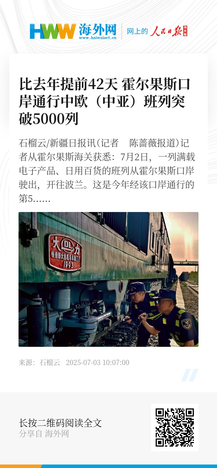 石榴云/新疆日报讯(记者 陈蔷薇报道)记者从霍尔果斯海关获悉:7月2日,一列满载电子产品、日用百货的班列从霍尔果斯口岸驶出,开往波兰。这是今年经该口岸通行的第5000列中欧(中亚)班列,较去年提前42天达到这一数字。