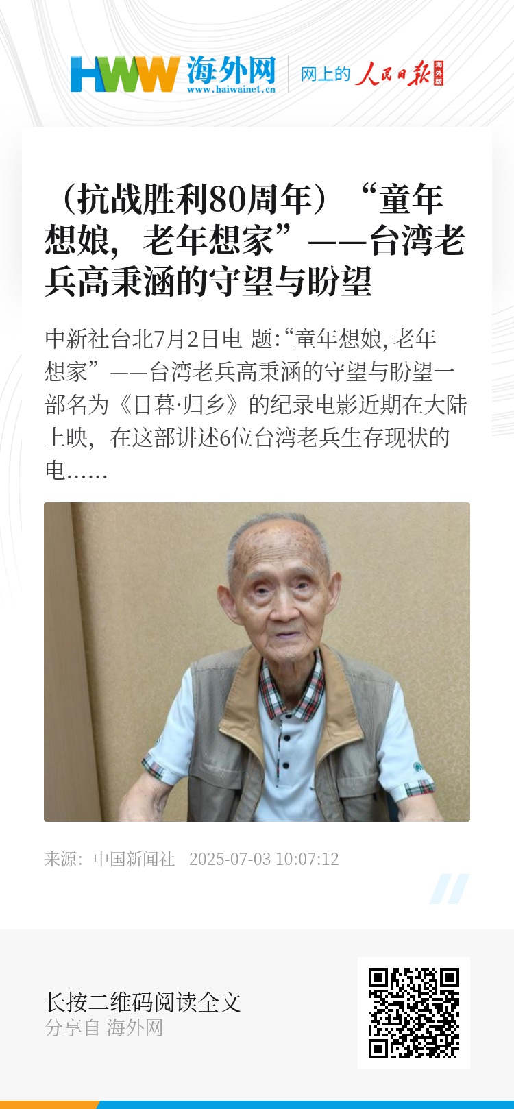 一部名为《日暮·归乡》的纪录电影近期在大陆上映,在这部讲述6位台湾老兵生存现状的电影中,高秉涵出现的时间多一些。这位曾经“感动中国”的台湾老兵,近日在台北接受中新社记者专访,他不断向记者强调,历史不能遗忘,要珍惜来之不易的和平,“为什么要到‘日暮’才能有回家的机会?因为有战争。而我要强调的,是和平。”