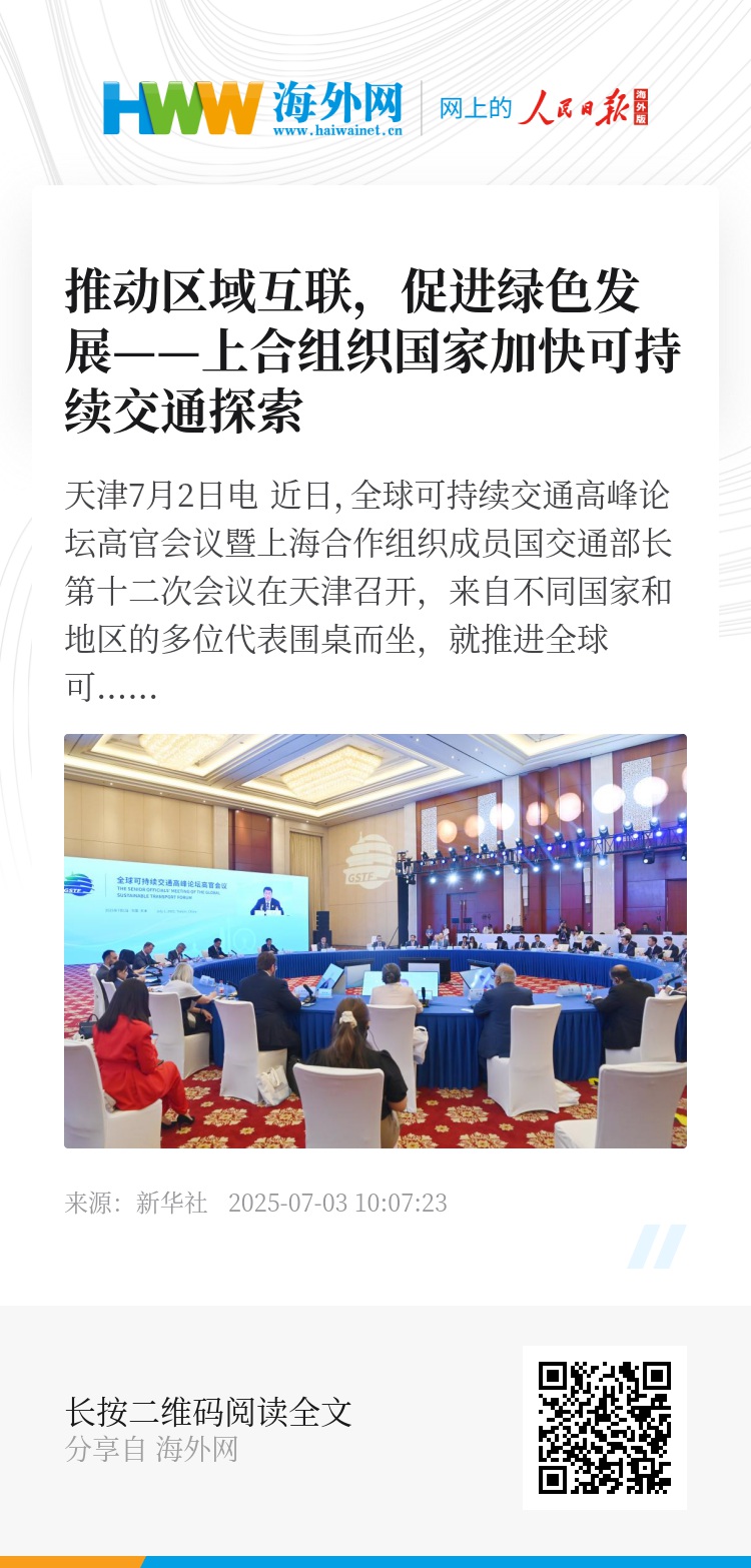 新华社天津7月2日电 近日,全球可持续交通高峰论坛高官会议暨上海合作组织成员国交通部长第十二次会议在天津召开,来自不同国家和地区的多位代表围桌而坐,就推进全球可持续交通合作等议题共商机遇。