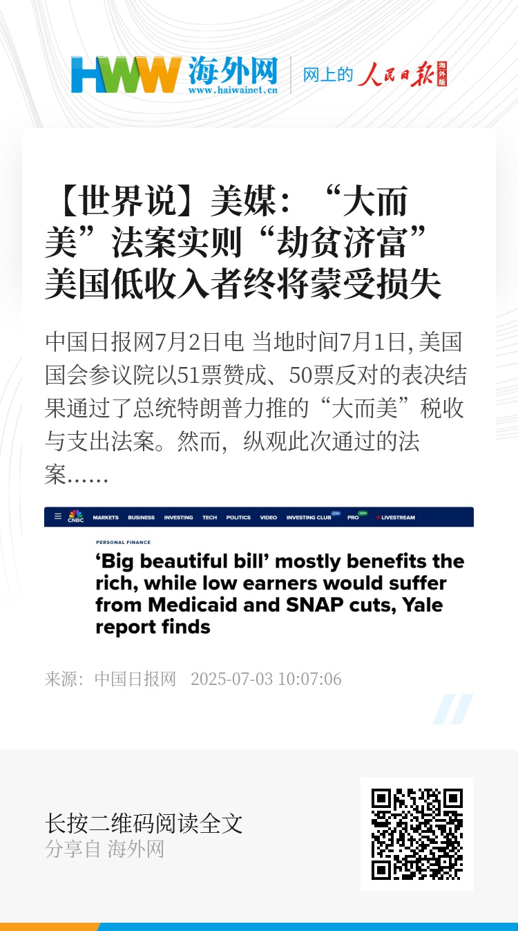 中国日报网7月2日电 当地时间7月1日,美国国会参议院以51票赞成、50票反对的表决结果通过了总统特朗普力推的“大而美”税收与支出法案。然而,纵观此次通过的法案对美国家庭财务可能带来的影响便会发现,所谓的“大而美”只是对最富有的美国人而已,对于那些需要领食品券、需要医疗补助的人来说,其实是“劫贫济富”。
