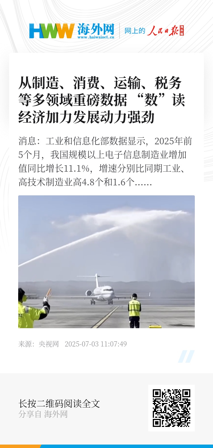 央视网消息:工业和信息化部数据显示,2025年前5个月,我国规模以上电子信息制造业增加值同比增长11.1%,增速分别比同期工业、高技术制造业高4.8个和1.6个百分点。