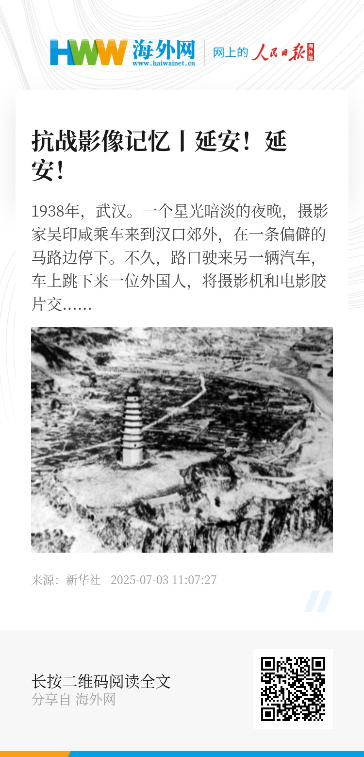 不久,路口驶来另一辆汽车,车上跳下来一位外国人,将摄影机和电影胶片交到吴印咸的手上,并用不太熟练的中国话低声说了一句“延安!延安!”。