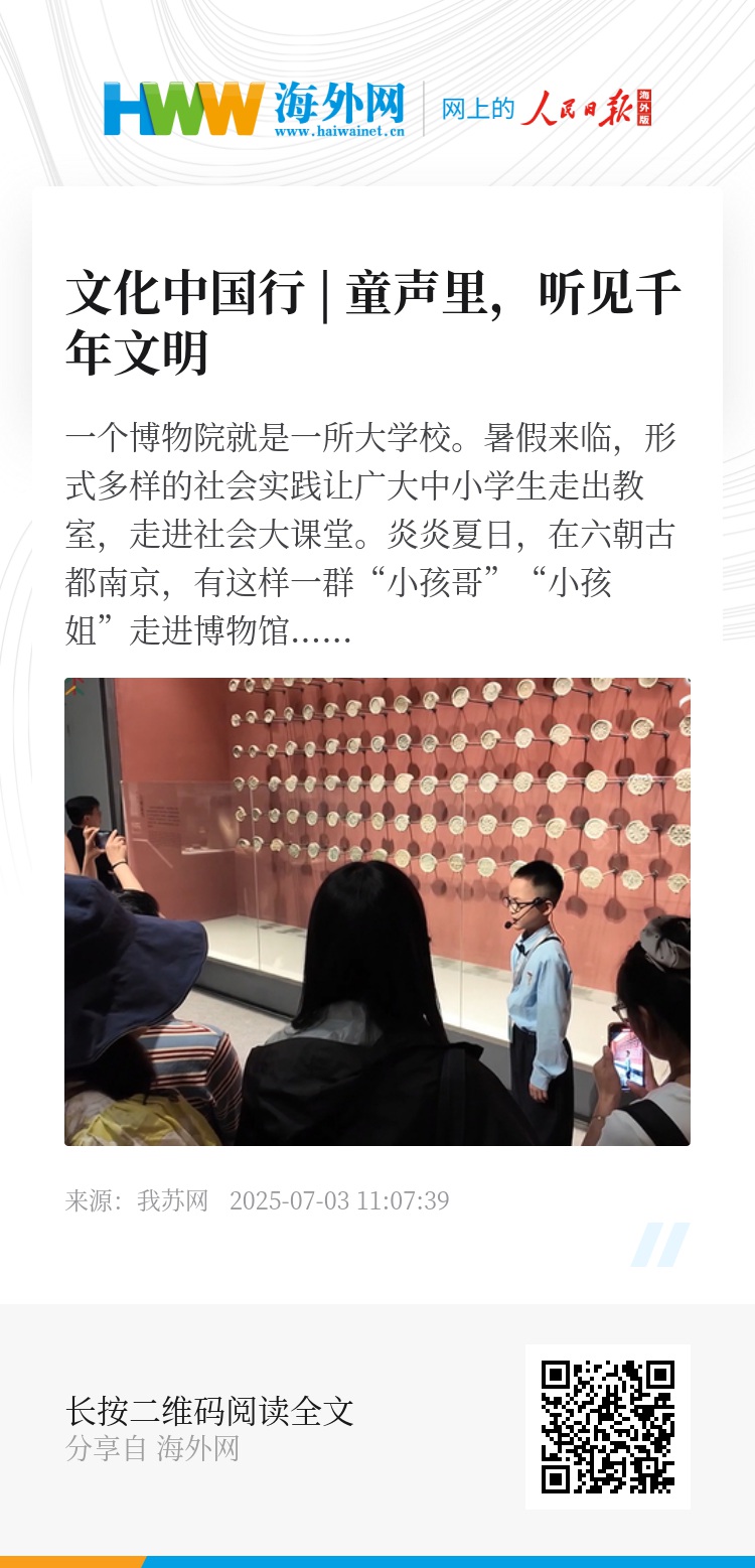 暑假来临,形式多样的社会实践让广大中小学生走出教室,走进社会大课堂。炎炎夏日,在六朝古都南京,有这样一群“小孩哥”“小孩姐”走进博物馆这所“大学校”,他们用稚嫩的童声开启了一段探索历史与文化奥秘的志愿服务之旅,传递着千年文明的温度。