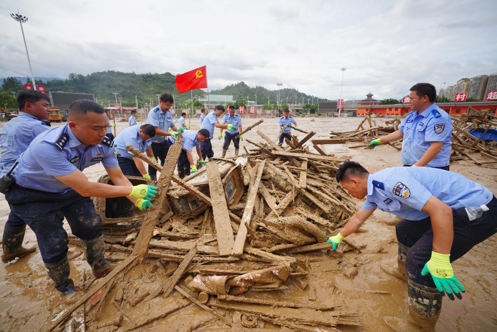 6月29日,在贵州省榕江县“村超”球场,来自丹寨县公安局的党员民警潘建航(左二)和同事一起清理因洪灾受损的球场设施。新华社发(杨武魁摄)