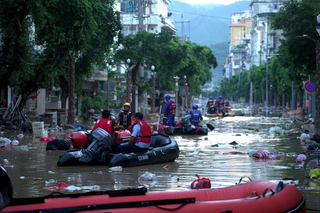 6月28日,救援人员帮助榕江县城内居民撤离。新华社记者 刘续 摄