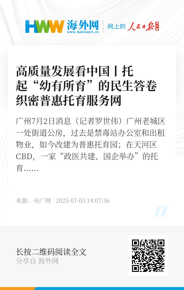 托育不仅是家庭之事,更是城市之治。从制度设计到社区托位,从财政保障到医育融合,从标准制定到人才培训,一张普惠、规范、温暖的托育网络正在广州成形。这张网络不只是解决“谁来带娃”的民生难题,更是支撑城市人口结构与社会活力的底层支撑。它托起的,是孩子的成长、家庭的稳定,也是城市的未来。