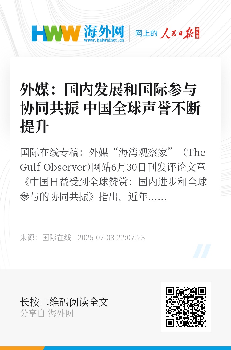 国际在线专稿:外媒“海湾观察家”(The Gulf Observer)网站6月30日刊发评论文章《中国日益受到全球赞赏:国内进步和全球参与的协同共振》指出,近年来中国在全球范围内的声望显著提升,这一成就得益于其国内经济社会繁荣发展和积极参与全球事务两者之间形成的协同效应。文章称,随着世界各国、各地区联系日渐紧密而动荡冲突不断,越来越多国家将中国视为全球增长的核心引擎,以及文化活力、政策稳定性与战略远见的典范。从古老文明的回响到现代产业的创新,中国的崛起不仅重塑自身,也正在推动全球叙事和发展方向朝着更加包容、均衡与合作的体系演进。