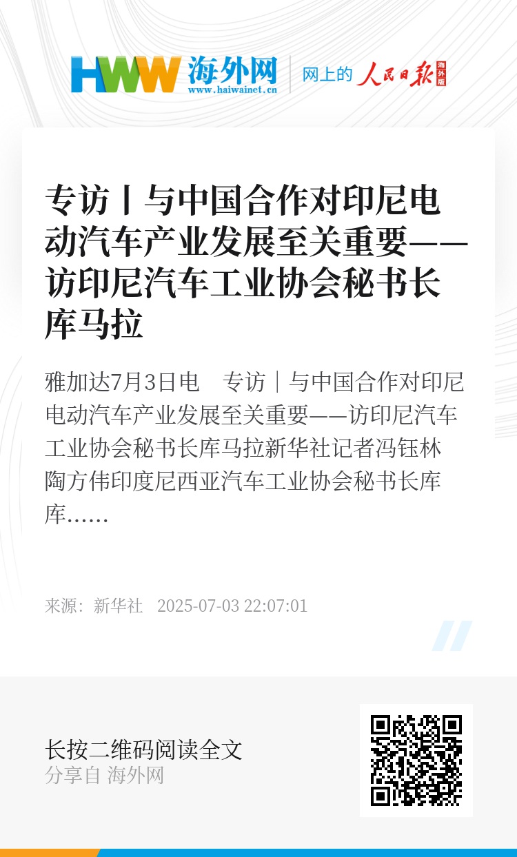 新华社雅加达7月3日电 专访|与中国合作对印尼电动汽车产业发展至关重要——访印尼汽车工业协会秘书长库马拉