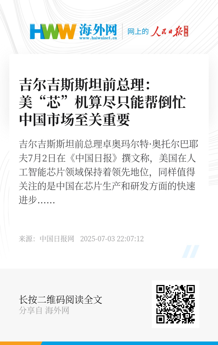 吉尔吉斯斯坦前总理卓奥玛尔特·奥托尔巴耶夫7月2日在《中国日报》撰文称,美国在人工智能芯片领域保持着领先地位,同样值得关注的是中国在芯片生产和研发方面的快速进步。遗憾的是,美国试图通过施加出口管制来阻碍中国人工智能发展,此举可能适得其反。