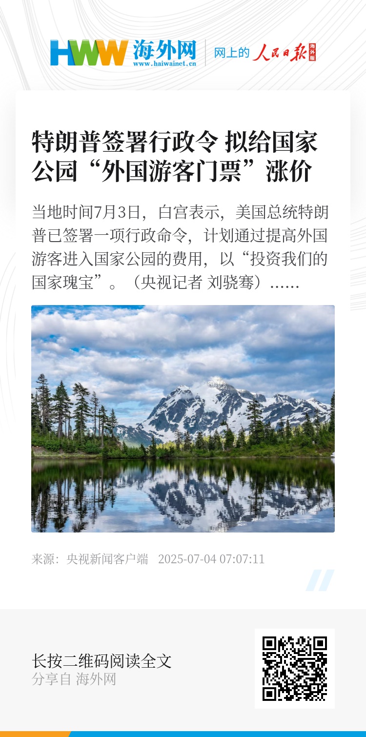 当地时间7月3日,白宫表示,美国总统特朗普已签署一项行政命令,计划通过提高外国游客进入国家公园的费用,以“投资我们的国家瑰宝”。(央视记者 刘骁骞)