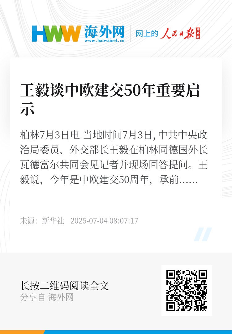 王毅说,今年是中欧建交50周年,承前启后、继往开来。中欧合作从无到有、从小到大。现在每一天贸易额相当于过去全年的贸易总量。中欧关系也不断迈上新的台阶,已结成全面战略伙伴。我们应以建交50周年为契机,全面总结并确认历史留给我们的重要启示,那就是:中欧关系的定位是伙伴,主流基调是合作,关键价值是自主,发展前景是共赢。双方应通过今年的高层往来,珍惜前人为此付出的心血,弘扬来之不易的合作精神,共同开辟中欧关系下一个更加坚韧自主、更加成熟稳定、更加目光远大的50年。