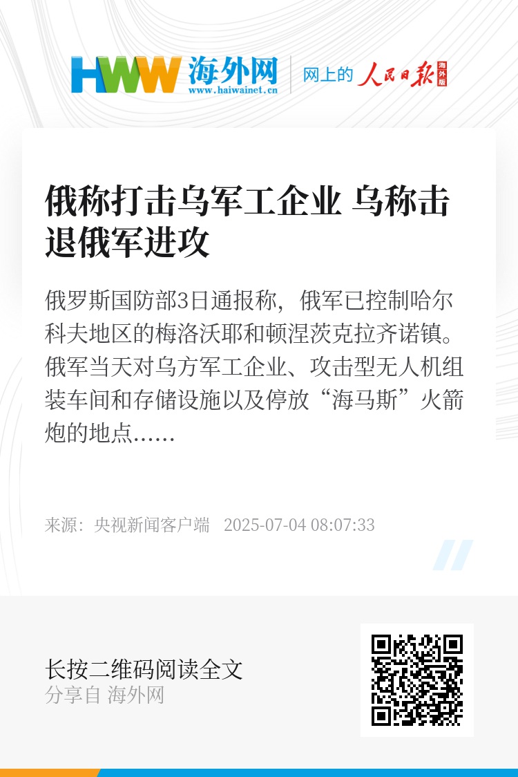 俄罗斯国防部3日通报称,俄军已控制哈尔科夫地区的梅洛沃耶和顿涅茨克拉齐诺镇。俄军当天对乌方军工企业、攻击型无人机组装车间和存储设施以及停放“海马斯”火箭炮的地点进行打击。俄防空系统拦截和击落多枚航空炸弹及一百多架无人机,并在黑海水域摧毁无人快艇。