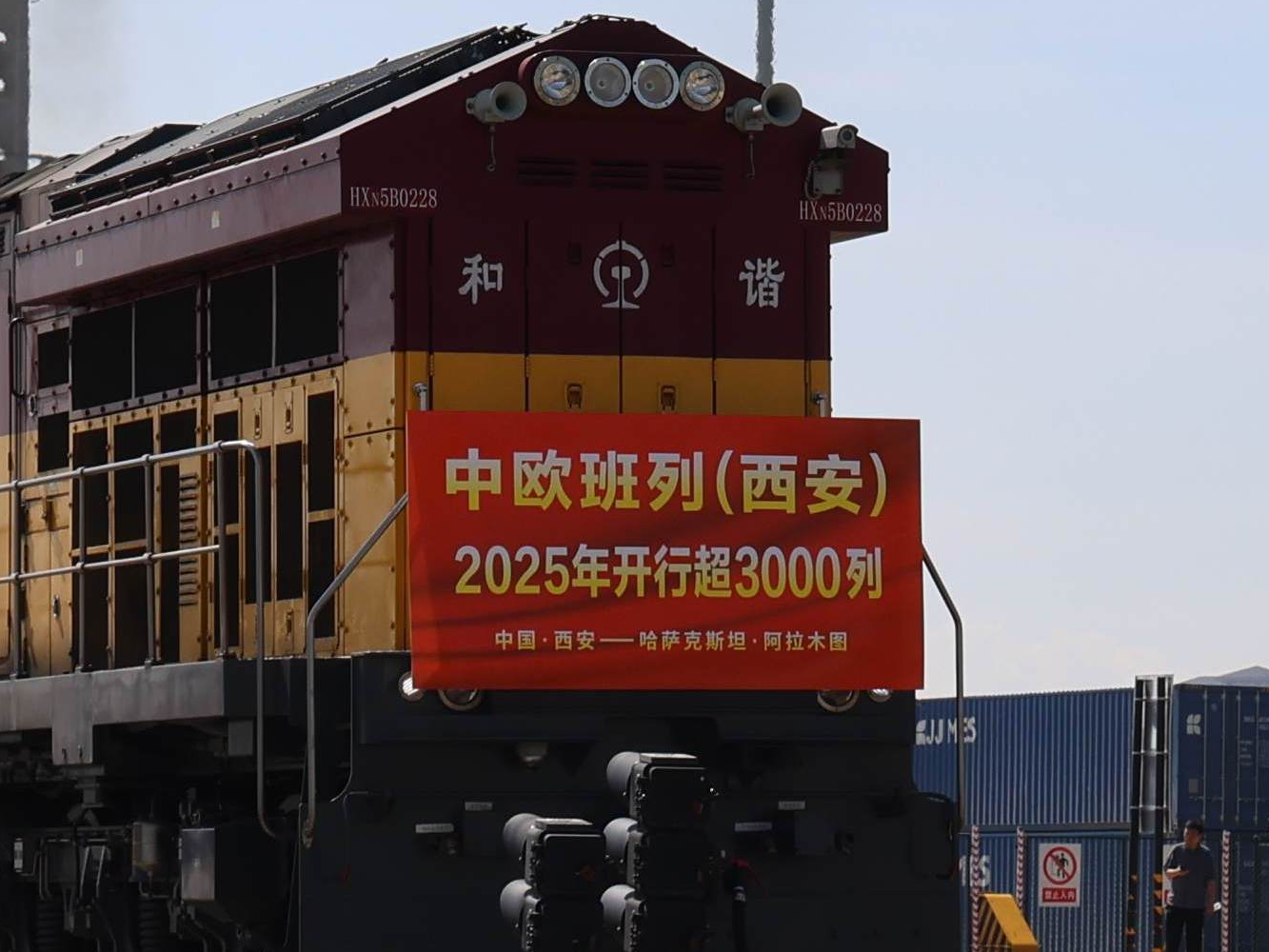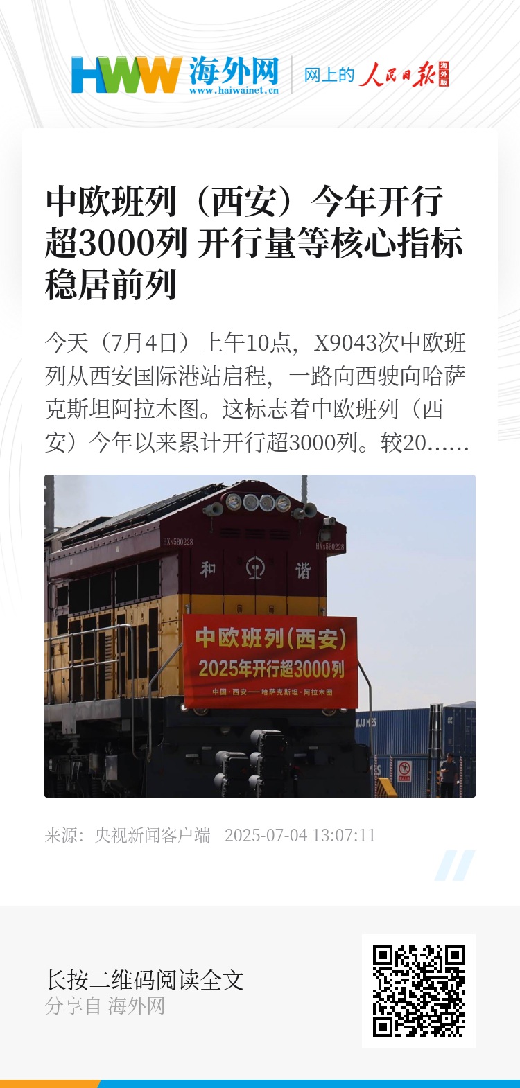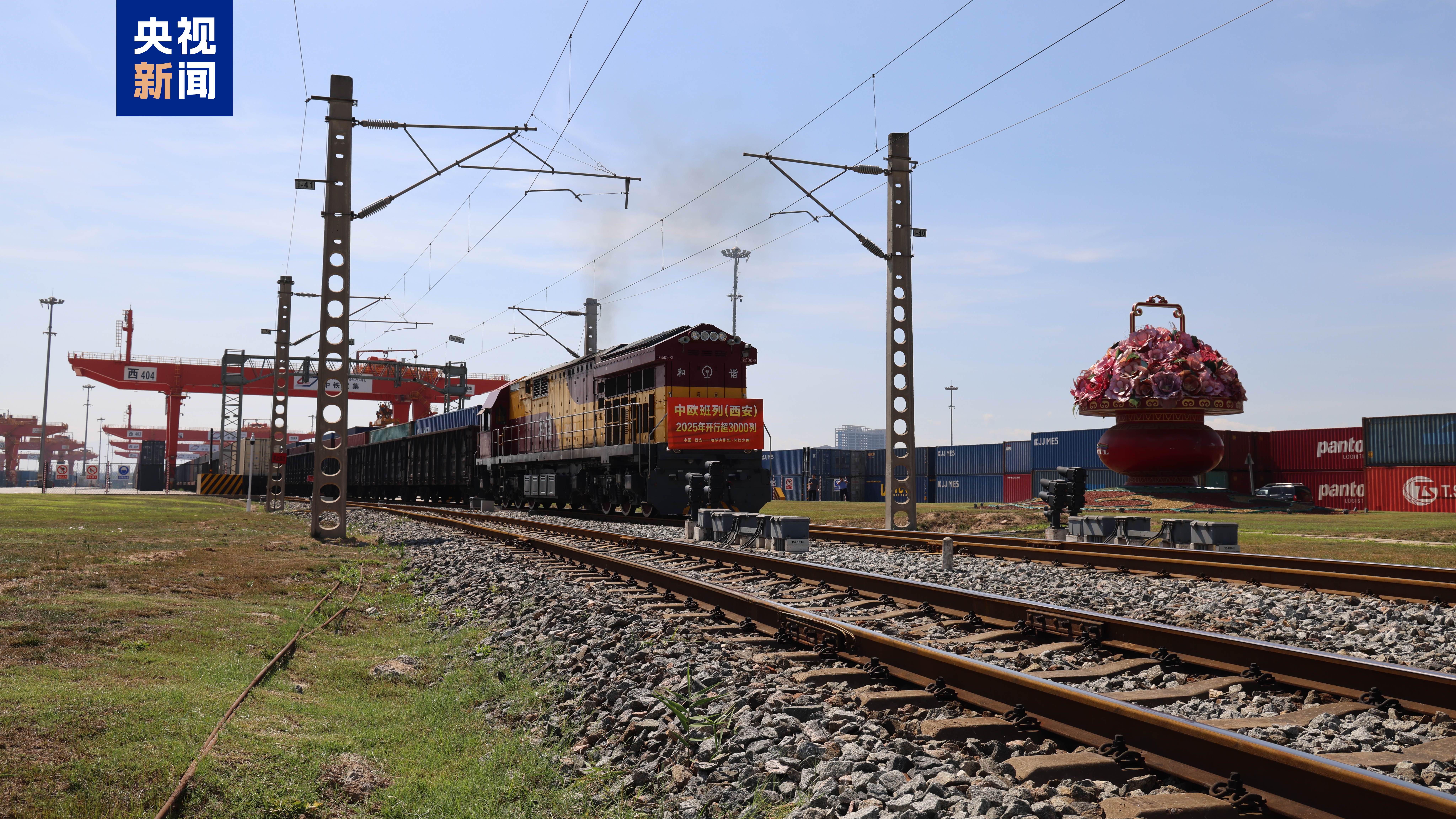 今天(7月4日)上午10点,X9043次中欧班列从西安国际港站启程,一路向西驶向哈萨克斯坦阿拉木图。这标志着中欧班列(西安)今年以来累计开行超3000列。较2024年提前40天完成3000列大关,开行量、货运量、重箱率等核心指标稳居全国前列。
