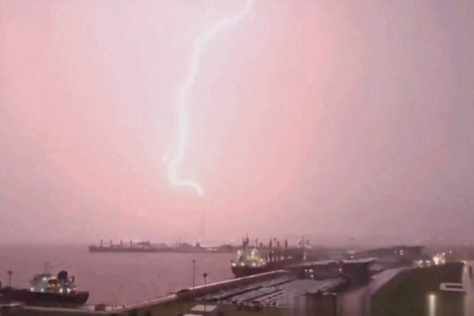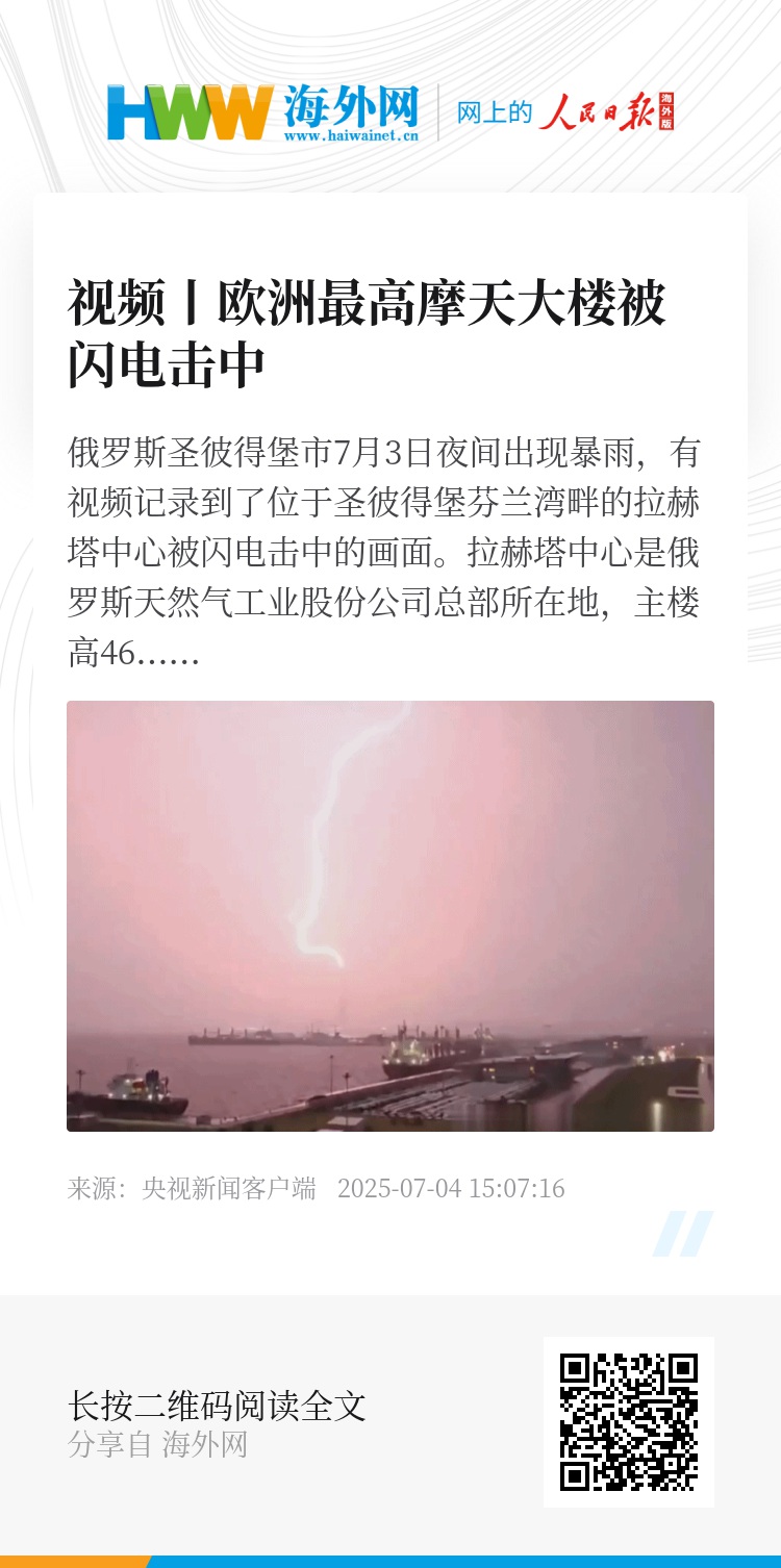 俄罗斯圣彼得堡市7月3日夜间出现暴雨,有视频记录到了位于圣彼得堡芬兰湾畔的拉赫塔中心被闪电击中的画面。