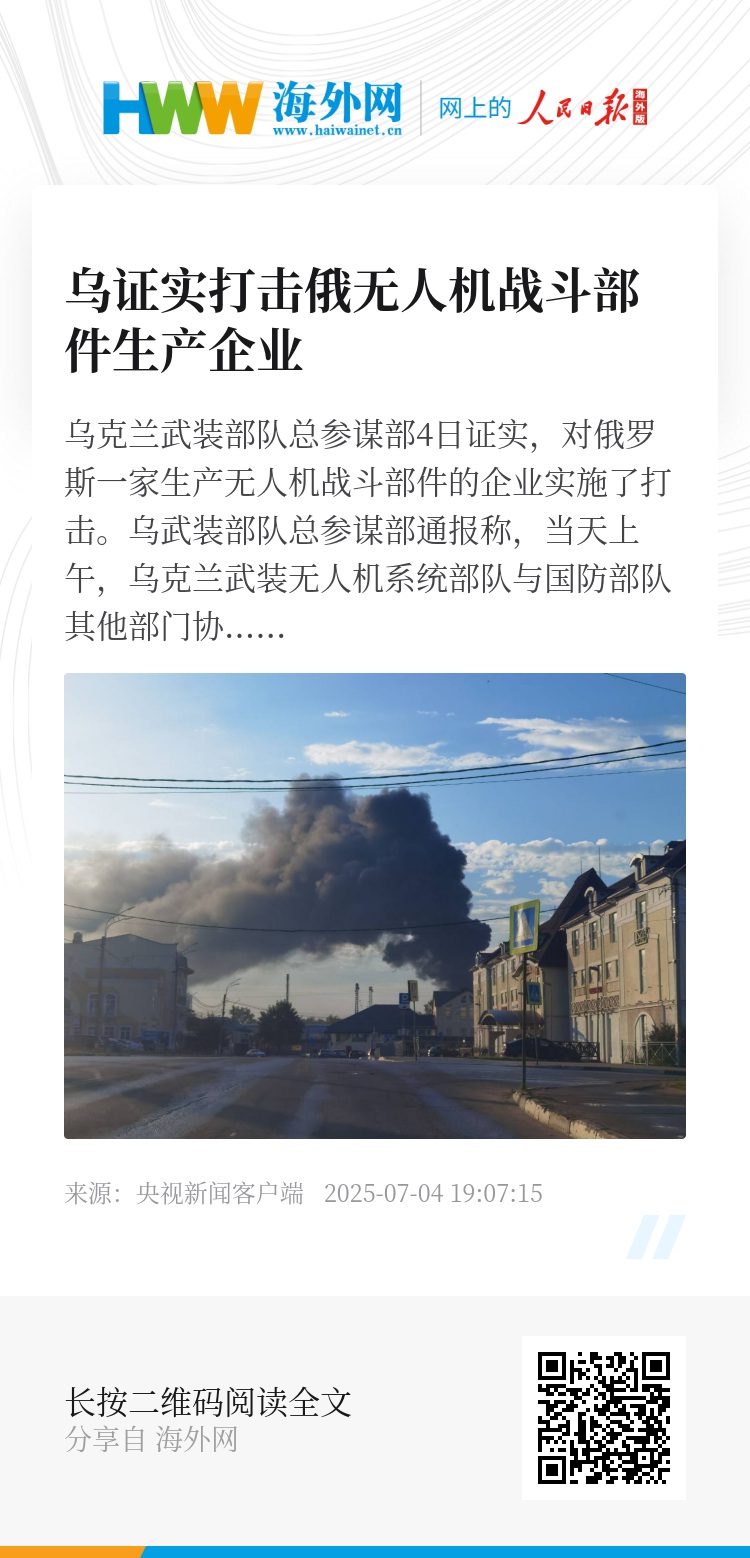 乌克兰武装部队总参谋部4日证实,对俄罗斯一家生产无人机战斗部件的企业实施了打击。