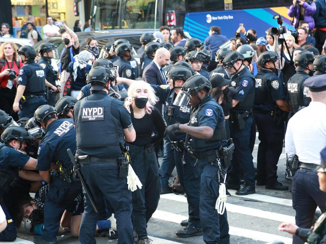 6月10日,在美国纽约曼哈顿下城联邦广场移民法庭附近,警察控制抗议者。新华社记者刘亚南摄