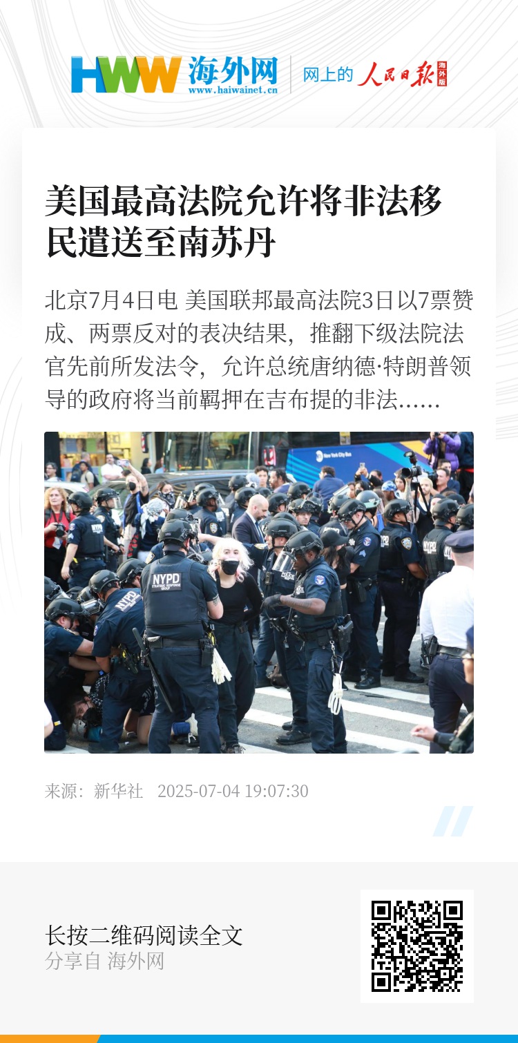 新华社北京7月4日电 美国联邦最高法院3日以7票赞成、两票反对的表决结果,推翻下级法院法官先前所发法令,允许总统唐纳德·特朗普领导的政府将当前羁押在吉布提的非法移民遣送至南苏丹。