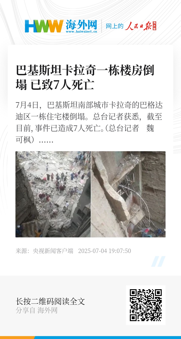 7月4日,巴基斯坦南部城市卡拉奇的巴格达迪区一栋住宅楼倒塌。总台记者获悉,截至目前,事件已造成7人死亡。(总台记者 魏可枫)