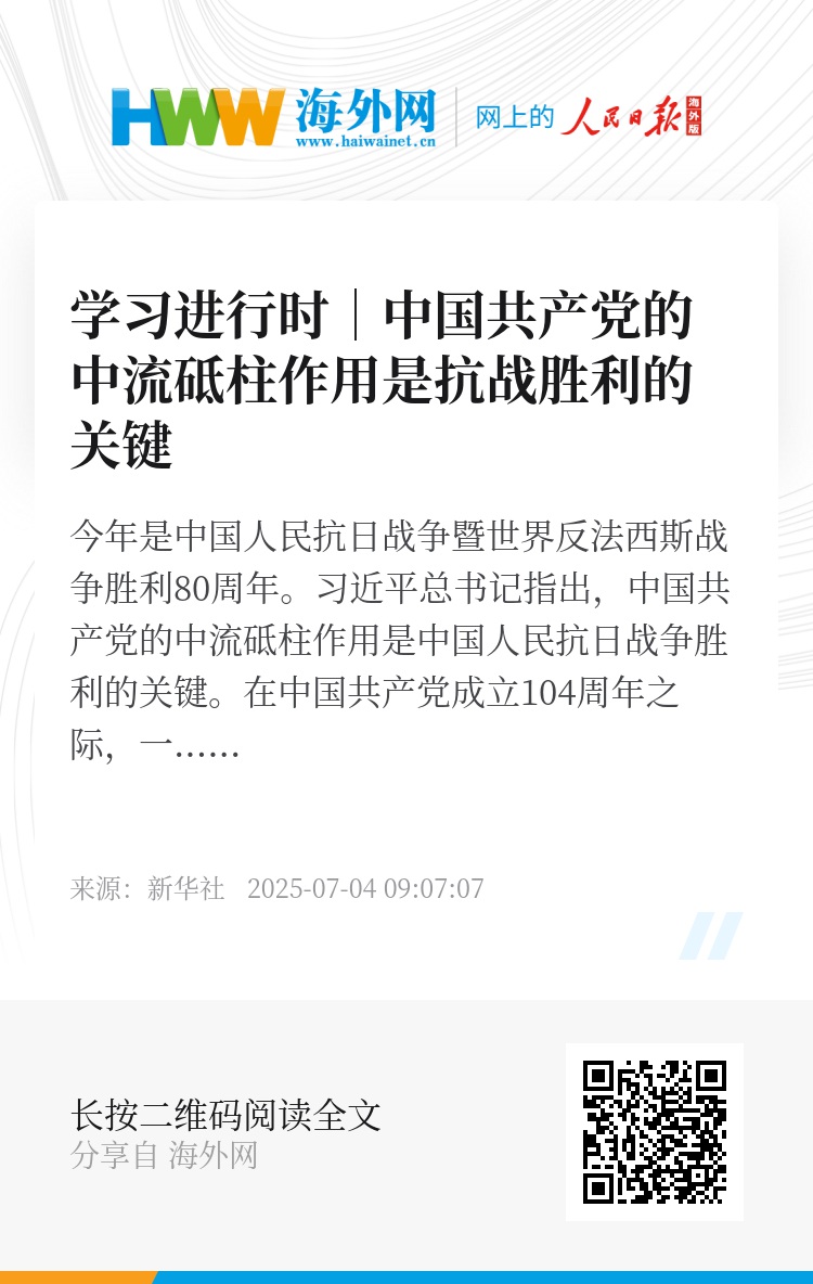 今年是中国人民抗日战争暨世界反法西斯战争胜利80周年。习近平总书记指出,中国共产党的中流砥柱作用是中国人民抗日战争胜利的关键。在中国共产党成立104周年之际,一起学习习近平总书记重要论述,重温中国共产党团结带领全国各族人民争取抗战胜利的伟大历程,凝聚强国建设民族复兴的奋进力量。
