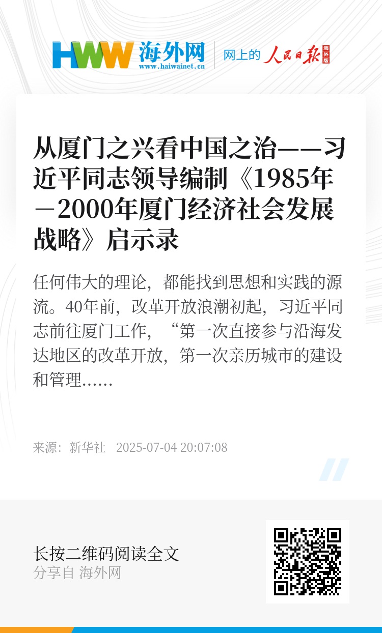 “习近平同志在领导编制发展战略时,秉持开放、前瞻、把握历史趋势的大局观,科学谋划,明确厦门发展的战略定位、指导思想、战略目标,这为当下全国和地方层面谋划‘十五五’时期经济社会发展提供了珍贵启示。”厦门大学经济学院教授张兴祥说。