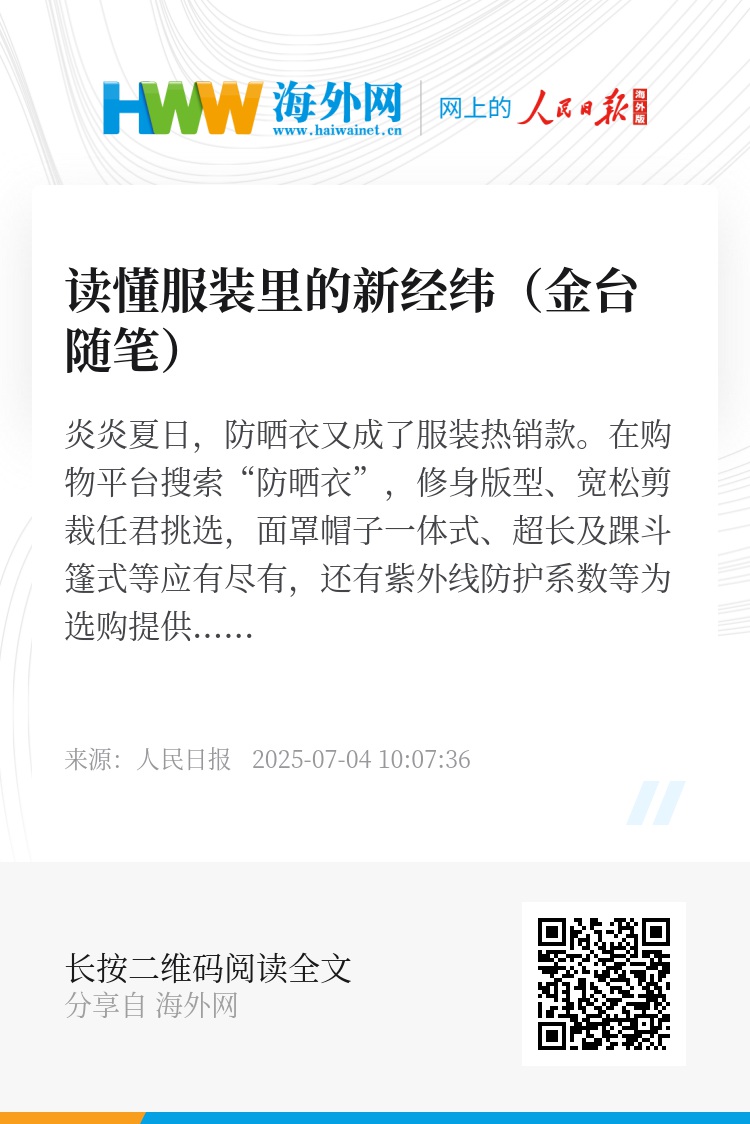 炎炎夏日,防晒衣又成了服装热销款。在购物平台搜索“防晒衣”,修身版型、宽松剪裁任君挑选,面罩帽子一体式、超长及踝斗篷式等应有尽有,还有紫外线防护系数等为选购提供重要参考。如果将时光回拨20年,人们对防晒衣还鲜有耳闻。服装不断“上新”,折射出潮流的更替与变迁,从中可以聆听到时代的律动。