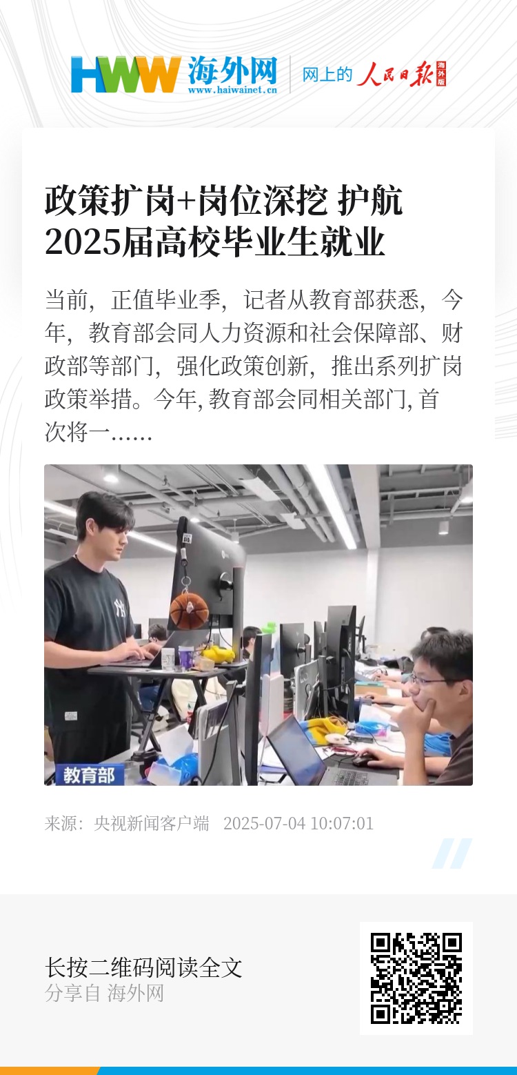 今年,教育部会同相关部门,首次将一次性扩岗补助对象范围由企业扩大到社会组织,综合运用税收优惠、就业补贴、扩岗补助、担保贷款等政策,支持民营企业、中小企业稳岗扩岗,激发各类经营主体吸纳高校毕业生就业的积极性和主动性。同时,还深挖国有企业和基层就业空间,全力帮助2025届高校毕业生尽早落实去向。