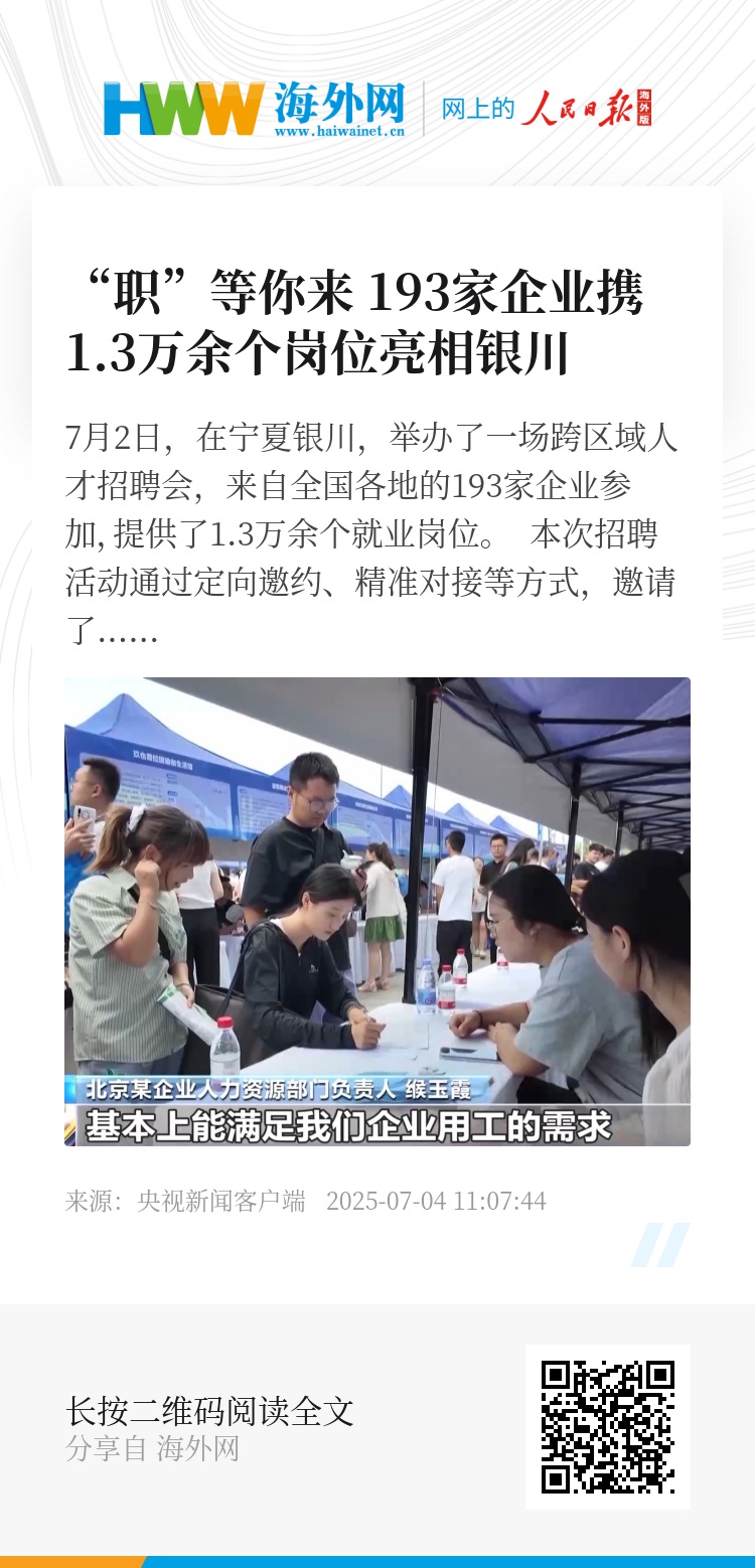 7月2日,在宁夏银川,举办了一场跨区域人才招聘会,来自全国各地的193家企业参加,提供了1.3万余个就业岗位。
