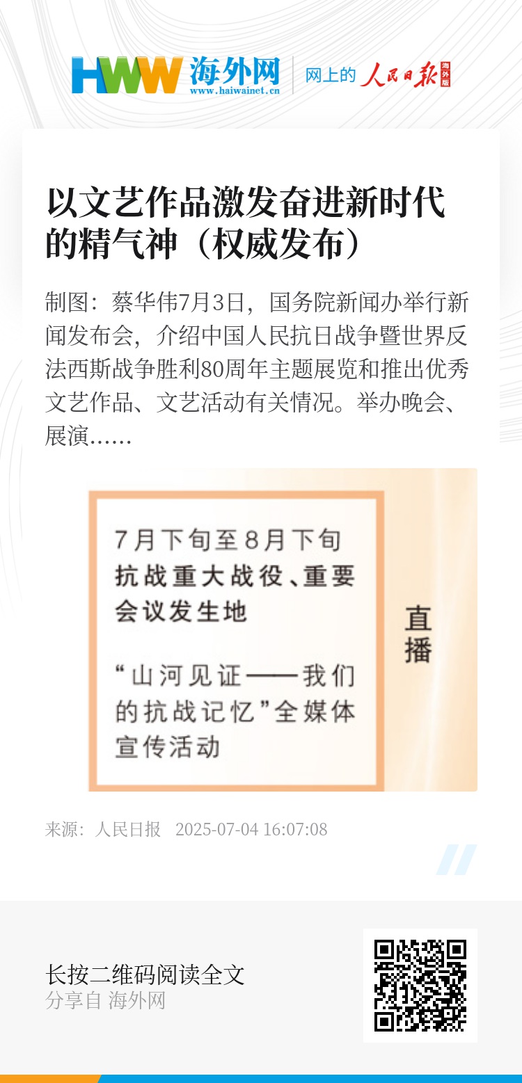 7月3日,国务院新闻办举行新闻发布会,介绍中国人民抗日战争暨世界反法西斯战争胜利80周年主题展览和推出优秀文艺作品、文艺活动有关情况。
