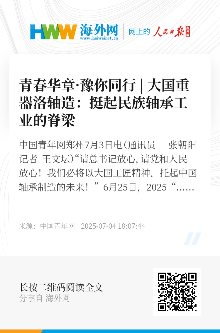 中国青年网郑州7月3日电(通讯员 张朝阳 记者 王文坛)“请总书记放心,请党和人民放心!我们必将以大国工匠精神,托起中国轴承制造的未来!”6月25日,2025“青春华章·豫你同行”大思政课网络主题宣传和互动引导活动在河南郑州启动。活动中,来自洛阳轴承集团(下称“洛轴”)技术创新团队青年工程师们的誓言铿锵有力。