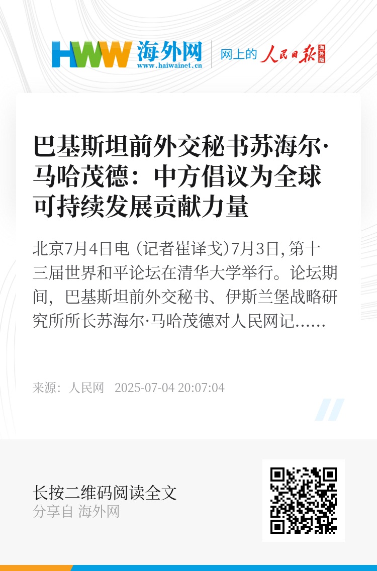 人民网北京7月4日电 (记者崔译戈)7月3日,第十三届世界和平论坛在清华大学举行。论坛期间,巴基斯坦前外交秘书、伊斯兰堡战略研究所所长苏海尔·马哈茂德对人民网记者表示,中方提出的共建“一带一路”倡议和三大全球倡议帮助各国提升互联互通水平,为世界经济可持续发展提供国际公共产品,作出重要贡献。