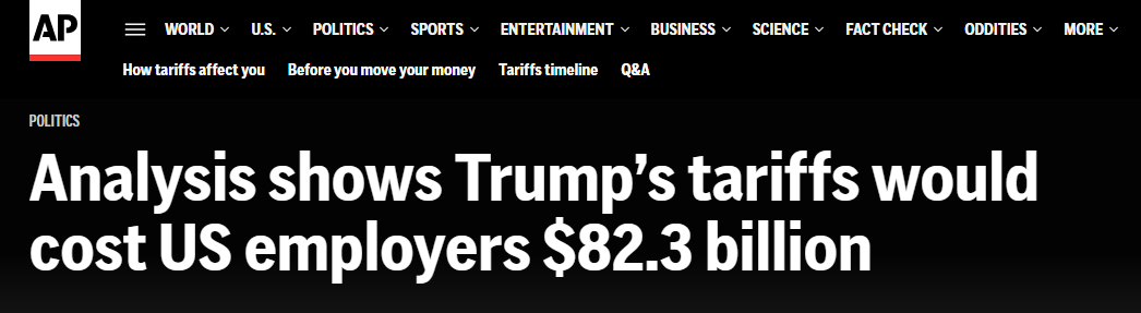 4月份,特朗普政府宣布所谓“对等关税”政策后,金融市场出现恐慌。随后,又设定了90天谈判期,期间多数进口商品面临10%基准税率。报道称,若4月2日的初始关税维持不变,研究中所涉及的企业将承受更为高昂的1876亿美元的额外成本。若按照现行税率,823亿美元成本平均到每位员工身上就是2080美元,相当于年均薪资的3.1%。这一平均值涵盖了无进口业务与有进口业务企业。