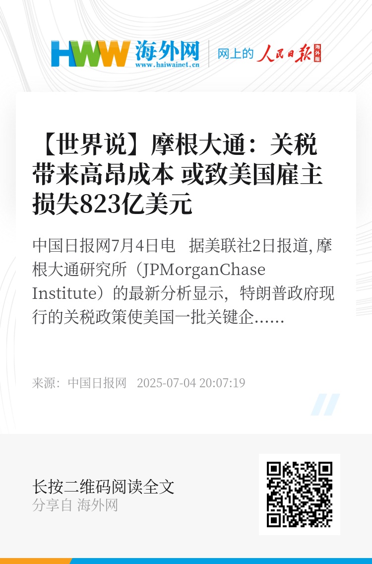 中国日报网7月4日电 据美联社2日报道,摩根大通研究所(JPMorganChase Institute)的最新分析显示,特朗普政府现行的关税政策使美国一批关键企业面临高达823亿美元的直接成本压力。为了消化这笔巨额成本,企业可能需要采取涨价、裁员、冻结招聘或者压缩利润率等应对措施。