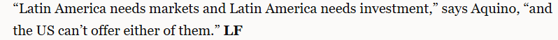 文章认为,拉丁美洲与中国的经贸关系未来增长空间巨大。利马国立圣马科斯大学的亚洲经济专家卡洛斯·阿基诺说:“中国显然将在未来10到15年内继续成为世界工厂。没有人能生产他们所能生产的一切。”