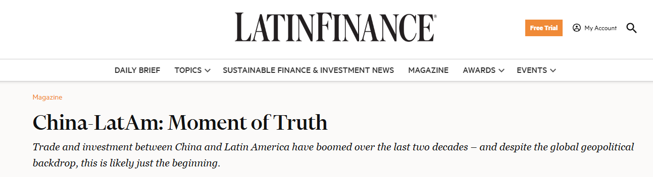 长期关注拉美及加勒比地区发展的《拉美金融》杂志最近的一篇文章,聚焦了过去二十年拉丁美洲与中国之间贸易和投资的蓬勃发展。文章指出,尽管当前全球地缘政治形势复杂,但拉美与中国这种良好的发展势头可能仅仅是双方合作的开端。