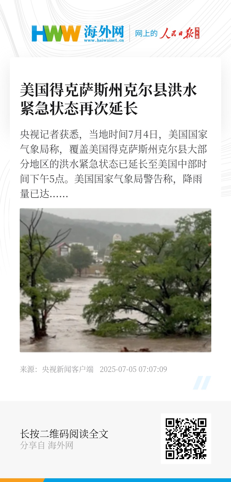 央视记者获悉,当地时间7月4日,美国国家气象局称,覆盖美国得克萨斯州克尔县大部分地区的洪水紧急状态已延长至美国中部时间下午5点。美国国家气象局警告称,降雨量已达6至12英寸。
