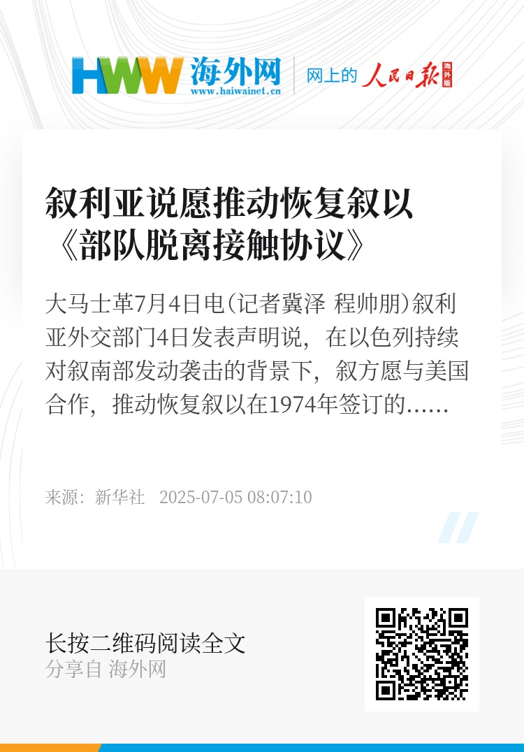 新华社大马士革7月4日电(记者冀泽 程帅朋)叙利亚外交部门4日发表声明说,在以色列持续对叙南部发动袭击的背景下,叙方愿与美国合作,推动恢复叙以在1974年签订的《部队脱离接触协议》。