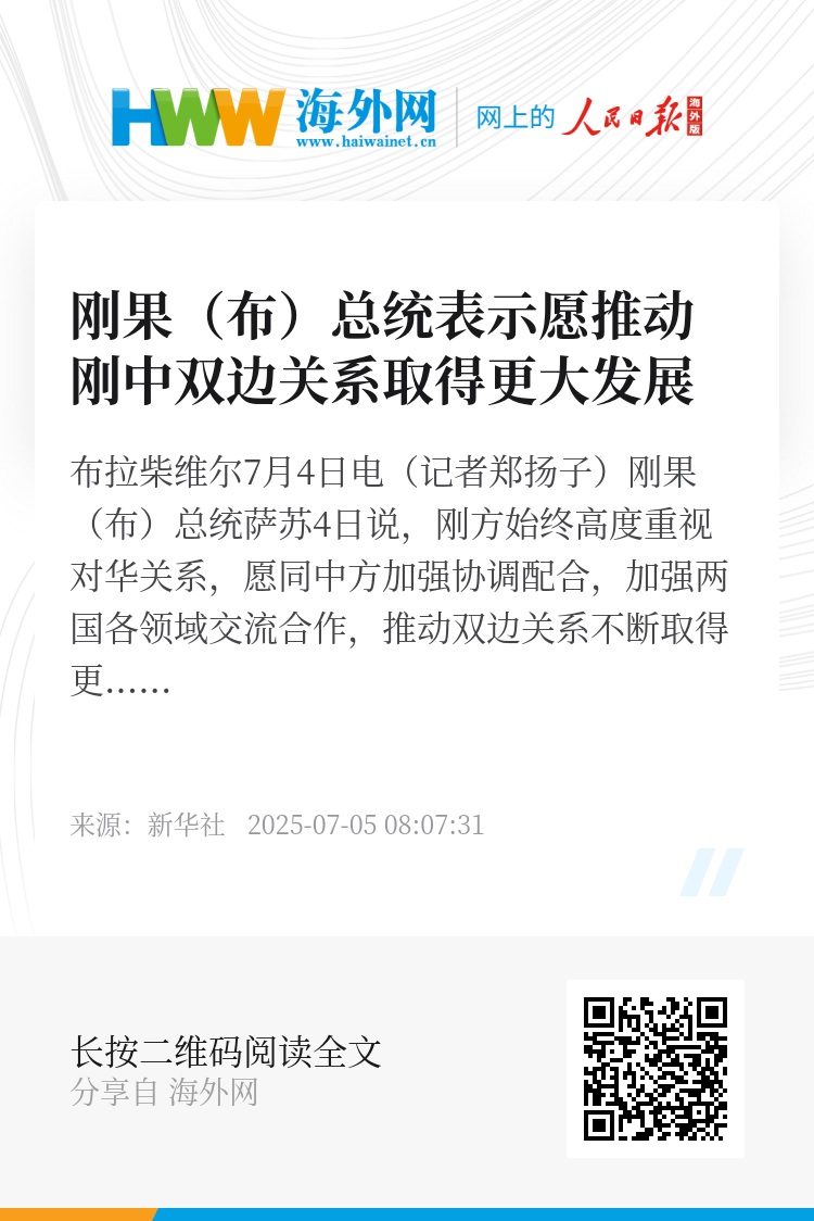 新华社布拉柴维尔7月4日电(记者郑扬子)刚果(布)总统萨苏4日说,刚方始终高度重视对华关系,愿同中方加强协调配合,加强两国各领域交流合作,推动双边关系不断取得更大发展。