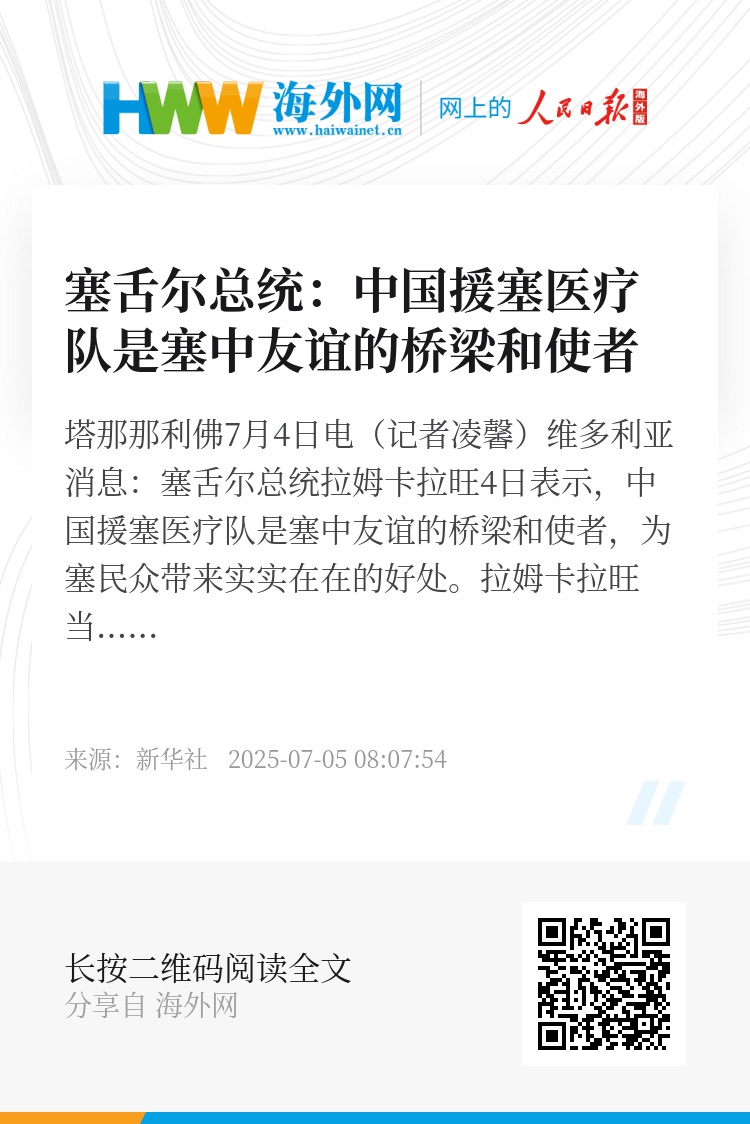 新华社塔那那利佛7月4日电(记者凌馨)维多利亚消息:塞舌尔总统拉姆卡拉旺4日表示,中国援塞医疗队是塞中友谊的桥梁和使者,为塞民众带来实实在在的好处。