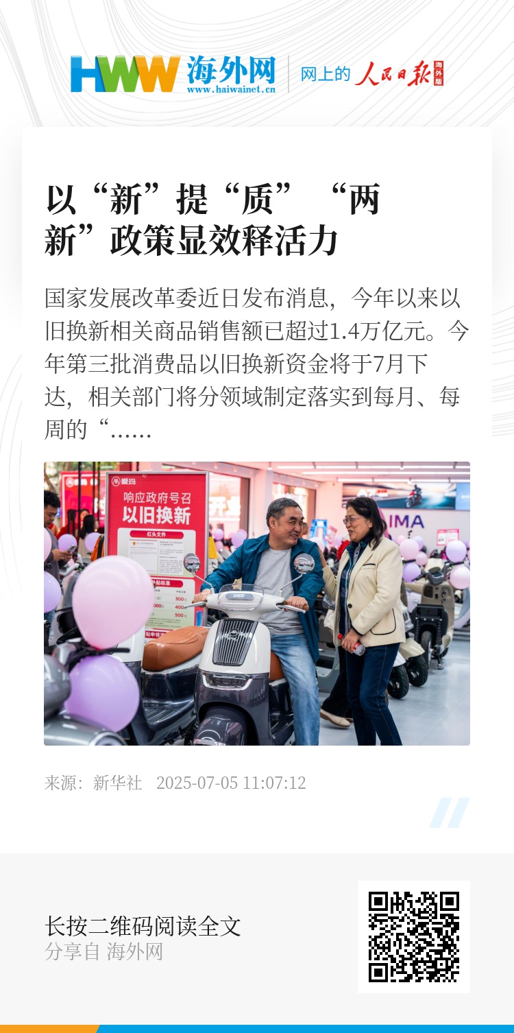 今年“两新”政策加力扩围实施以来,有力增强了消费活力。