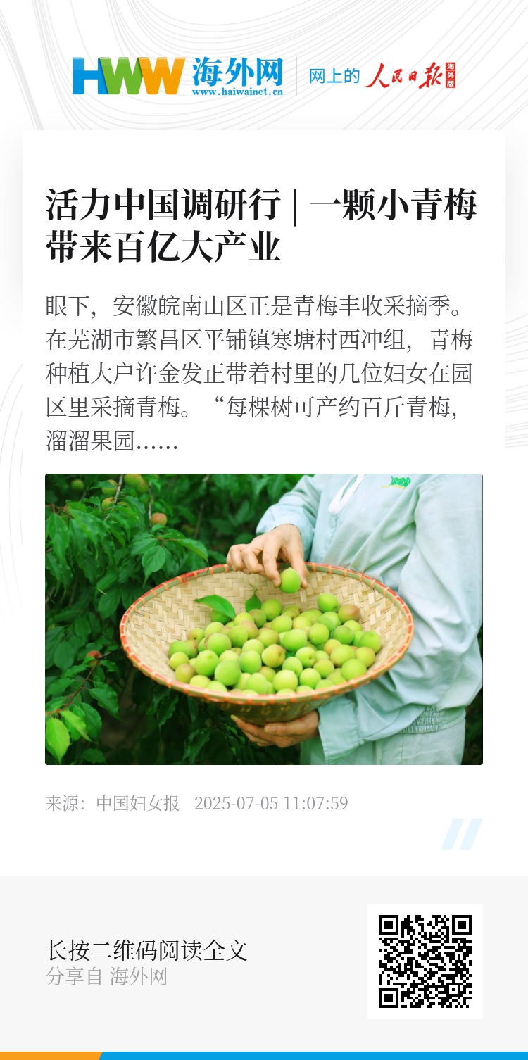 目前,溜溜果园已经在安徽、福建、广西等八个省份推广青梅种植30多万亩,总产值近200亿元,用农业科技和产业发展助力青梅种植户增收致富。