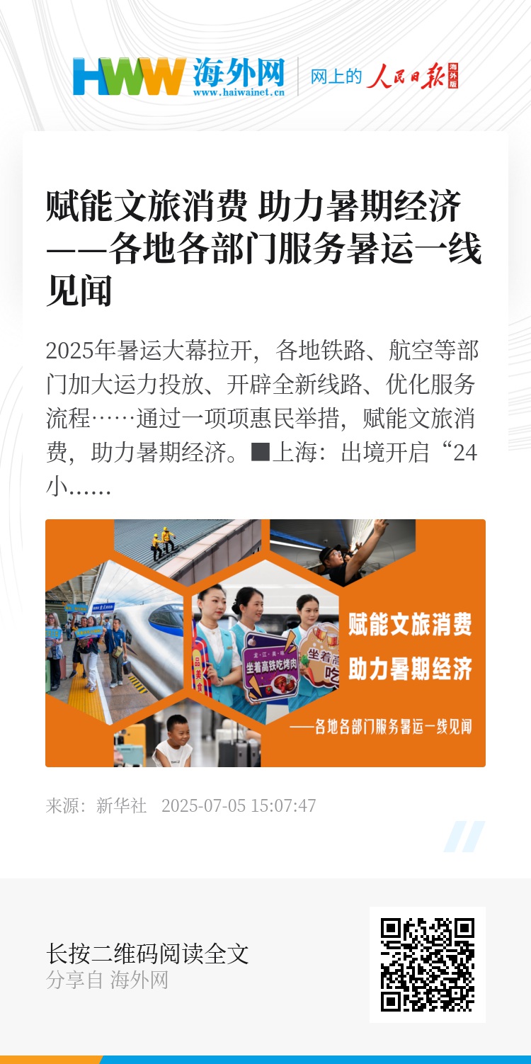 随着中国免签“朋友圈”进一步扩大,交通便利、支付便利等措施的普及,越来越多的外国人来华,加上暑期学生旅游需求的叠加,使得各地文旅消费、暑期经济蓬勃发展。各地铁路、航空、公路等部门,推出一个个惠民举措,增加运力投放、强化服务内容,为旅客出行增添更多新选择。