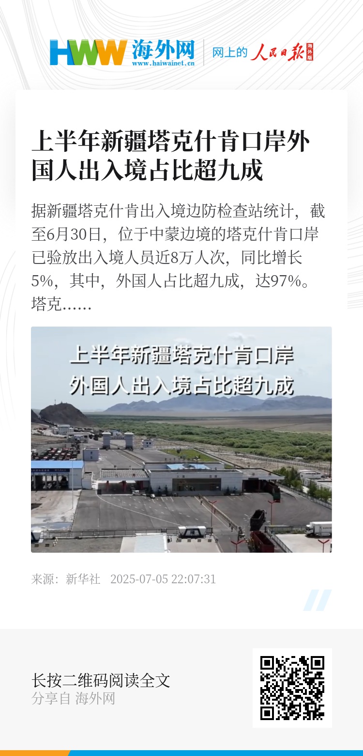 据新疆塔克什肯出入境边防检查站统计,截至6月30日,位于中蒙边境的塔克什肯口岸已验放出入境人员近8万人次,同比增长5%,其中,外国人占比超九成,达97%。