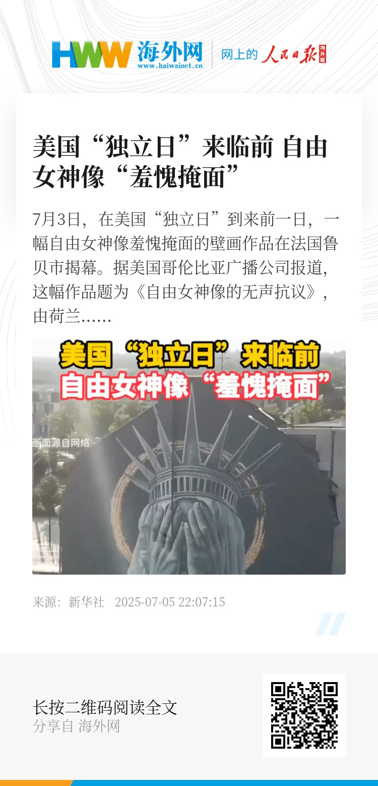 7月3日,在美国“独立日”到来前一日,一幅自由女神像羞愧掩面的壁画作品在法国鲁贝市揭幕。