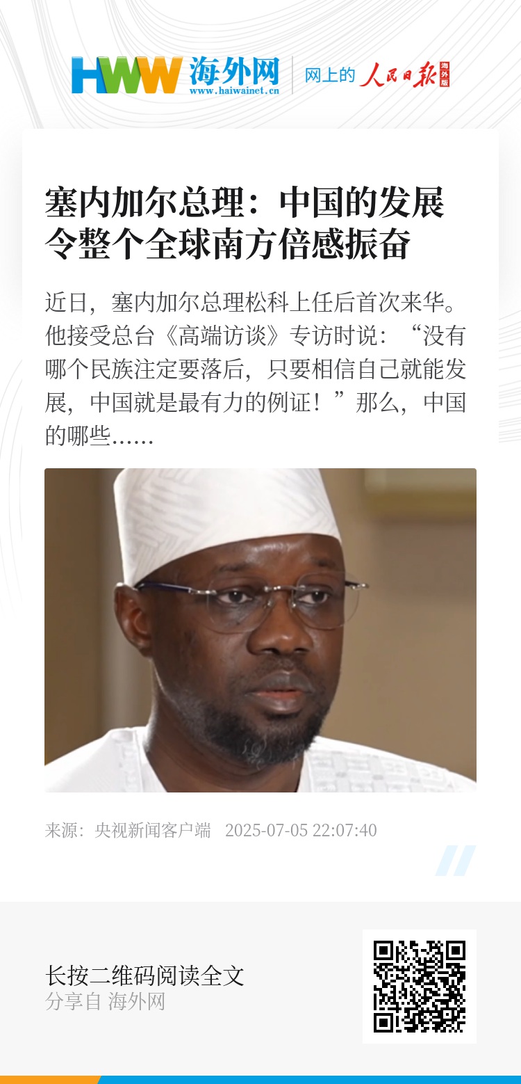近日,塞内加尔总理松科上任后首次来华。他接受总台《高端访谈》专访时说:“没有哪个民族注定要落后,只要相信自己就能发展,中国就是最有力的例证!”
