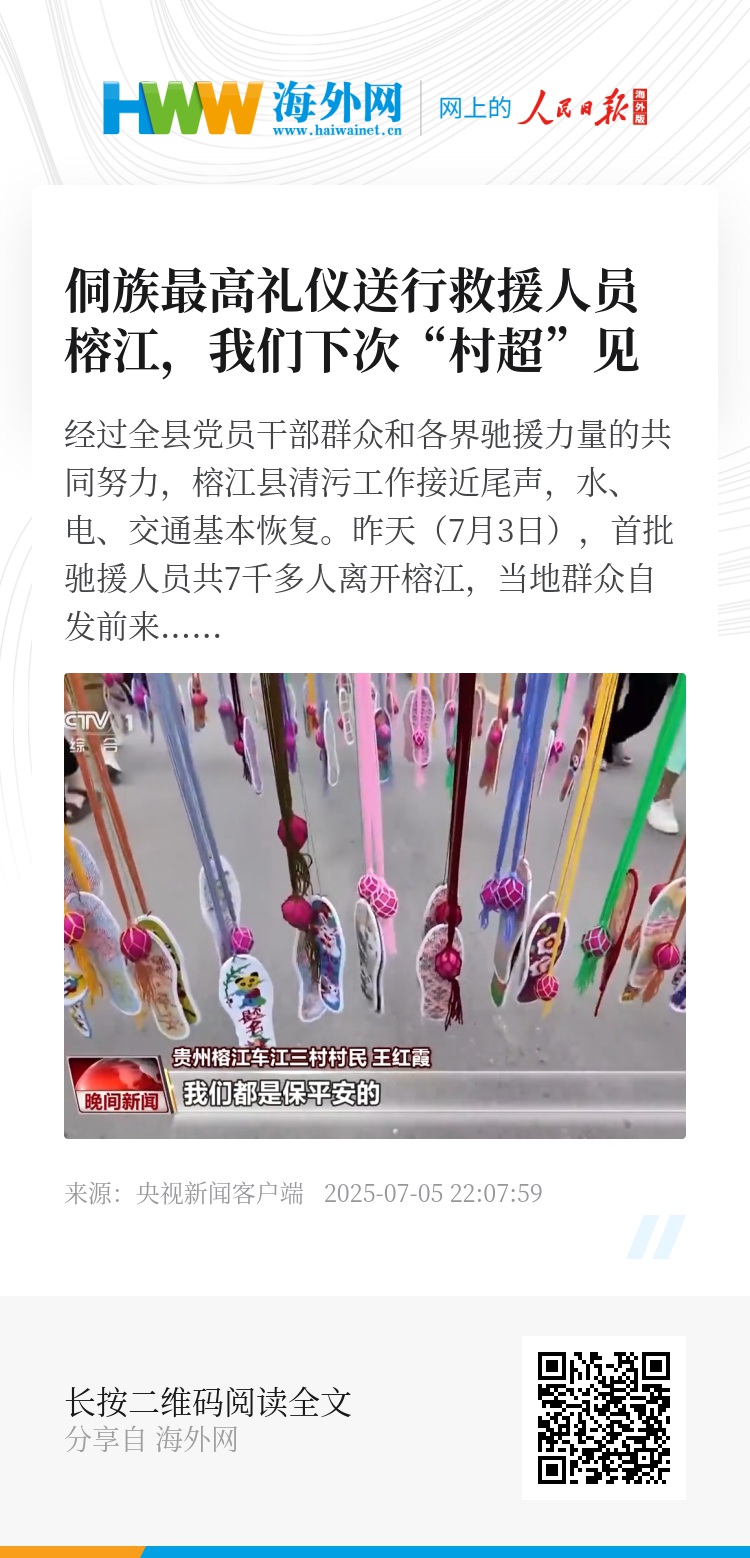 经过全县党员干部群众和各界驰援力量的共同努力,榕江县清污工作接近尾声,水、电、交通基本恢复。昨天(7月3日),首批驰援人员共7千多人离开榕江,当地群众自发前来送行,感谢这些为榕江奋战过的人们。