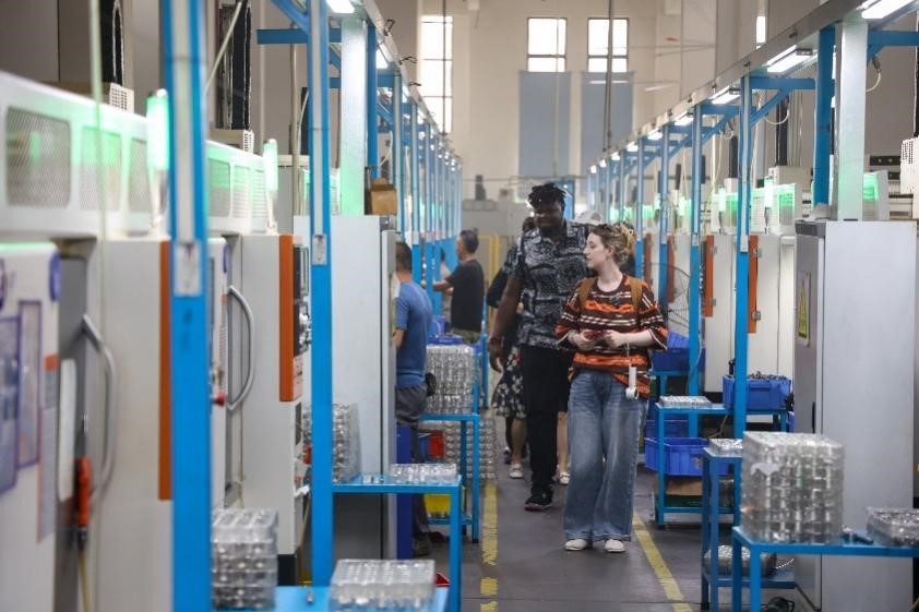 图为外国青年博主们在参观自动化车间。海外网 谢明摄