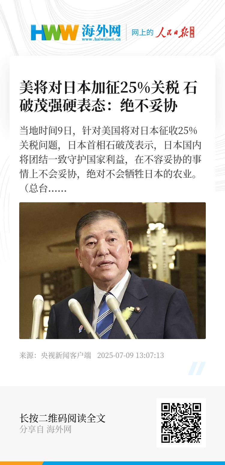 当地时间9日,针对美国将对日本征收25%关税问题,日本首相石破茂表示,日本国内将团结一致守护国家利益,在不容妥协的事情上不会妥协,绝对不会牺牲日本的农业。(总台报道员 柏春洋)