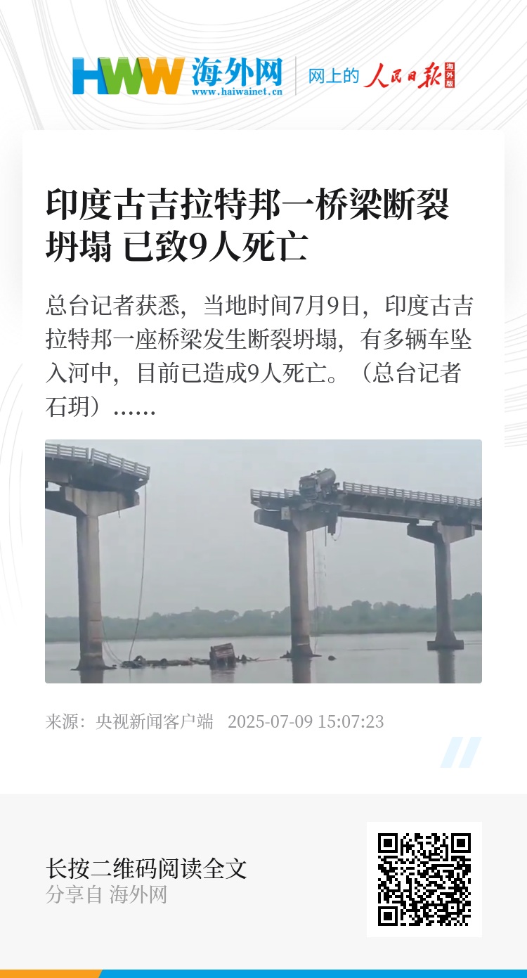 总台记者获悉,当地时间7月9日,印度古吉拉特邦一座桥梁发生断裂坍塌,有多辆车坠入河中,目前已造成9人死亡。(总台记者 石玥)