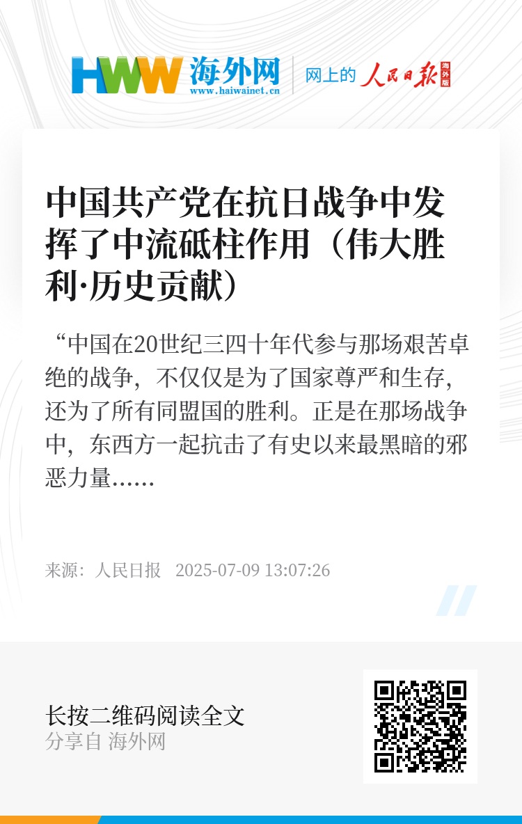 “抗日战争是中国现代史上意义最为重大的事件之一,展现了中国人民不惧外敌入侵、捍卫国家主权与民族尊严的决心。”米特近日在接受本报记者专访时表示,中国共产党广泛动员中国军民英勇抵抗,发挥了中流砥柱作用,这成为中国人民抗日战争胜利的关键。从1937年中国共产党推动形成抗日民族统一战线,到1938年毛泽东撰写《论持久战》等理论著作成功指导中国抗战实践,再到抗战期间实施土地政策、加强意识形态建设为战后中国规划发展蓝图,至抗日战争胜利时中国共产党已发展到超过百万名党员的规模……抗日战争既是中国共产党逐步发展壮大的重要阶段,也是西方社会读懂中国的重要历史窗口。